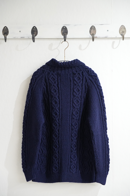INVERALLAN(インバーアラン)は、約30年ほど前に英国スコットランドで創業され、現在では英国で紡績されているアランニットでは世界最高峰と言われるブランドです。使用されているウールは、その年に新しく生え変わった羊毛(ピュアニューウール)を使用しており、厚手ながら柔らかく、保温性もあり耐久性にも優れています。また、熟練ニッターが編み上げる最高峰の美しさを持つ編み模様や、ハンドメイドの特性でもあるフィット感(弾力)は量産品のそれっぽいニットとは大きく差別化されると言ってもいいでしょう。長く愛用するほどに体に馴染むようなシルエットも魅力の1つと言えます。