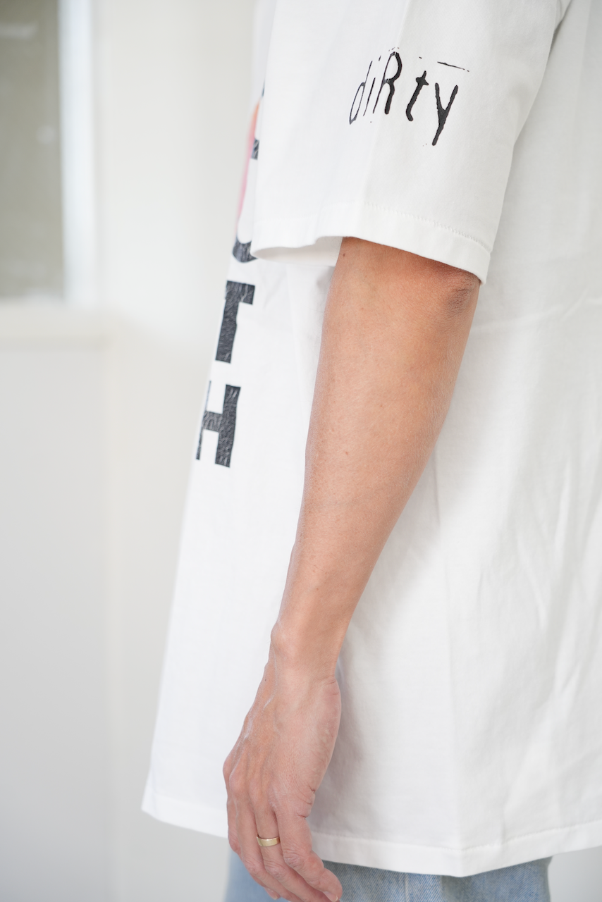 SONIC YOUTHのヴィンテージTシャツの中でも入手困難と言われるこのグリーンボディ「DIRTY」を再現。ボディ・ラバープリントに使用された染料は経年変化によって当時のような風合いへと驚くような変化を楽しませてくれます。サイズ3は当時のヴィンテージTシャツ(BROCKUMやHanes BEEFY-T)のXLサイズに相当します。