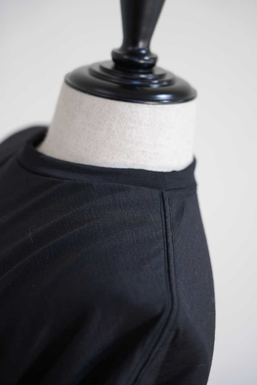 国内のメリヤス専業工場で縫製し、裾には熟練の職人の手を必要とする天地引き、ネックまわりには強度の高いタコバインダー仕様を採用しました。