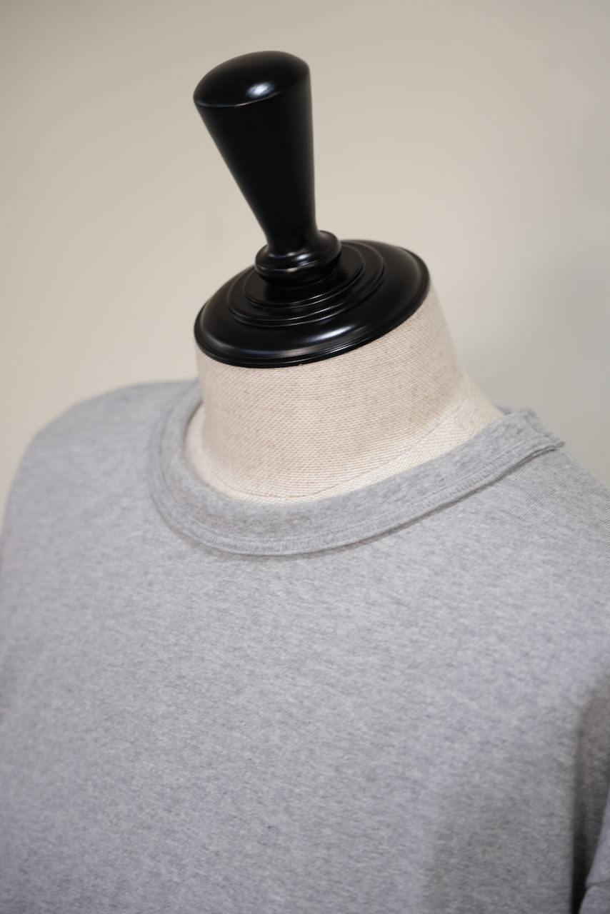 吊り丸胴生地はインナーウエアでの使用をメインに想定されていることから、通常タイトな寸法のものがほとんど。吊り編み機らしいふんわりと柔らかな風合いをたっぷりとした身幅で楽しめる傑作と呼ぶに相応しくも何気ない一枚です。