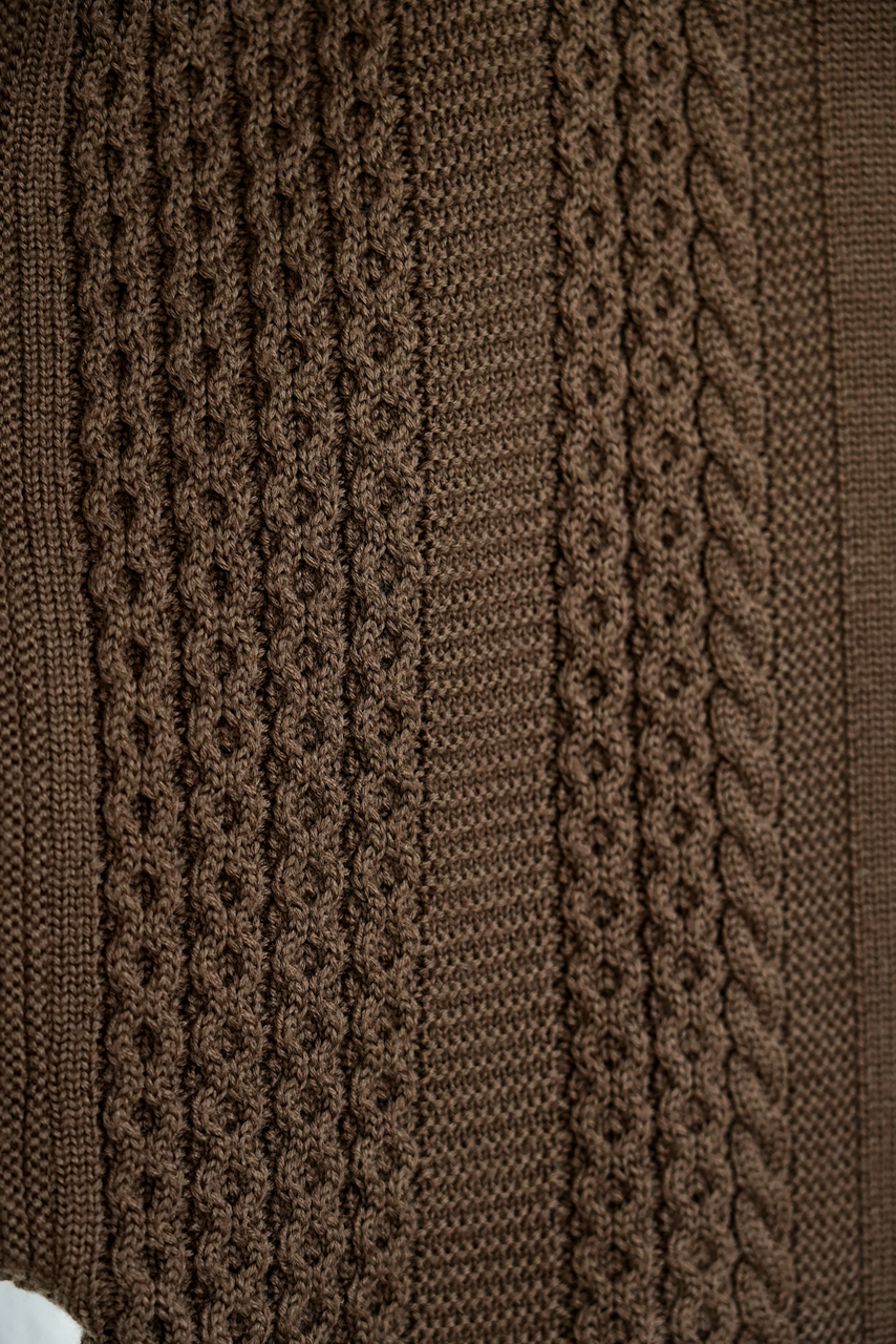 ベースのプレーンな天竺編みで積もらずに溶けた雪で濡れて光る車道を表し、肩の丸みのあるケーブル編みで脇に積もった雪とふわふわと降る雪を表しています。