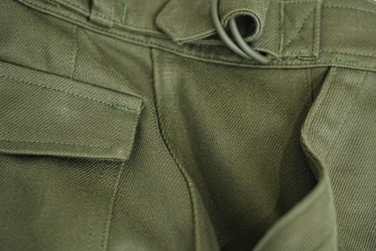 フランス軍モーターサイクルパンツを思わせる⾁厚で粗めな⽣地でありつつM47初期型をイメージして作られた綾織ヘビーコットンツイル。メキシコのピマコットンを混ぜた太番⼿の⽷を⽢く撚り、スラブ感のある⽣地に織り上げました。経年変化が期待できる染⾊⽅法を⽤い、はき込むごとに⾃然な退⾊が楽しめます。