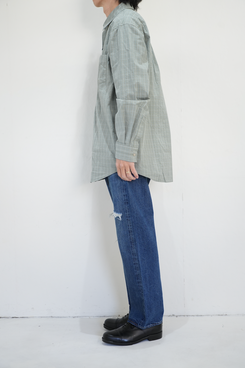 レギュラーカラー シャツ(Blue)と同様の形ですが、タイプライターによるナチュラルなハリ感とチェック生地は春のアウターのようです。手で触るとテック生地のようなゴソゴソという音と手触りの感触はポリ混紡20%くらいなイメージですがしっかり綿100%。そして「高密度」という表現が当店でもよく使用されますがギュッと詰まってるというのは現代ではそんなに簡単な話でもなくなっているわけです。