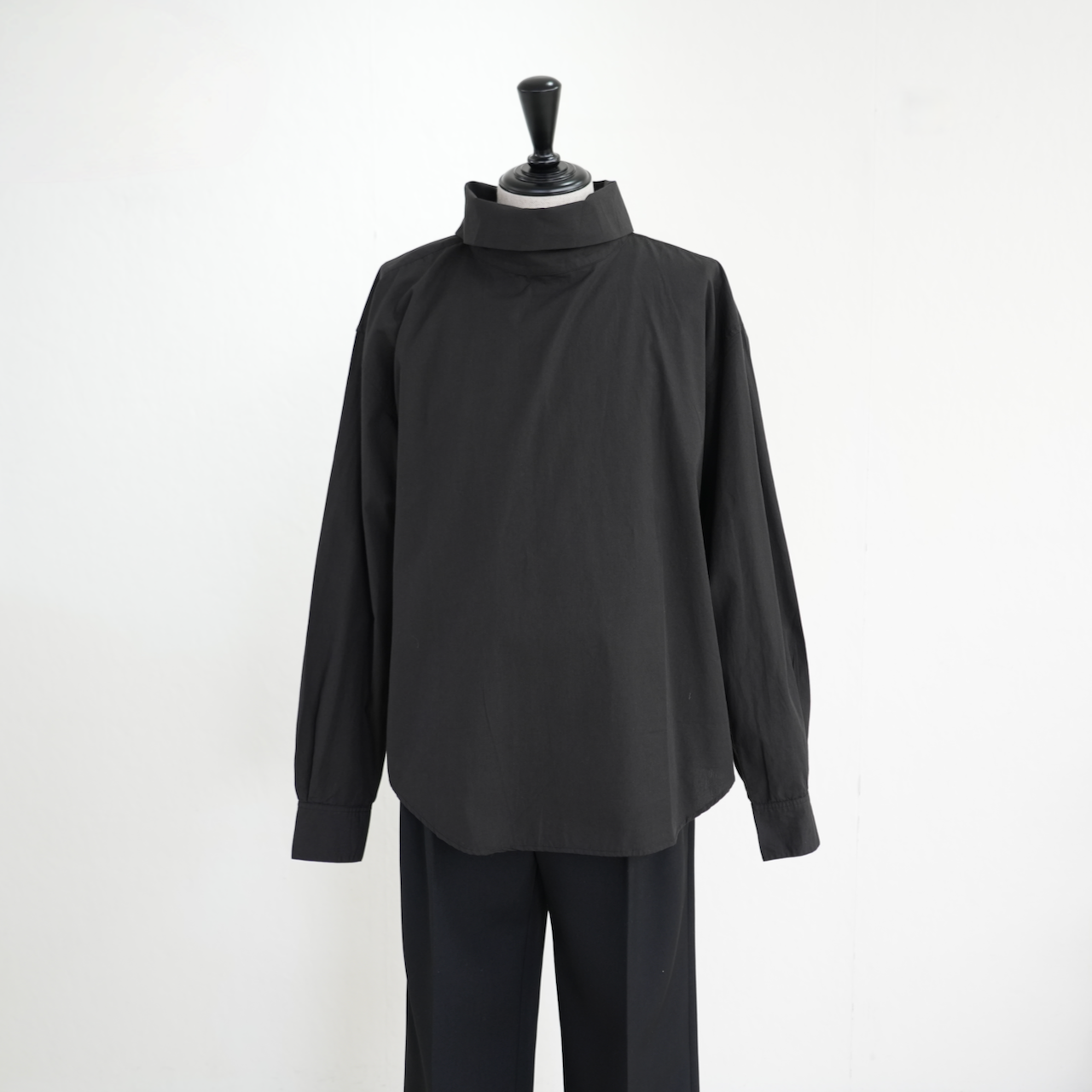 フェンシングウェアから着想を得たプルオーバーシャツ。たっぷりとしたハイネックは背面のボタンでアレンジ自在です。インド綿の風合いと絶妙なミスマッチング(ブロードのようなドレス生地ではなく、あえて凹凸感のある素材を選んでいるところが最高)がシャツ1枚でもレイヤードしても表情豊かなコーディネイトがお楽しみいただけます。