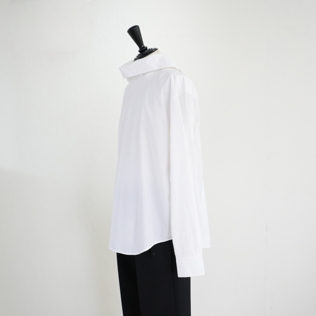 フェンシングウェアから着想を得たプルオーバーシャツ。たっぷりとしたハイネックは背面のボタンでアレンジ自在です。インド綿の風合いと絶妙なミスマッチング(ブロードのようなドレス生地ではなく、あえて凹凸感のある素材を選んでいるところが最高)がシャツ1枚でもレイヤードしても表情豊かなコーディネイトがお楽しみいただけます。