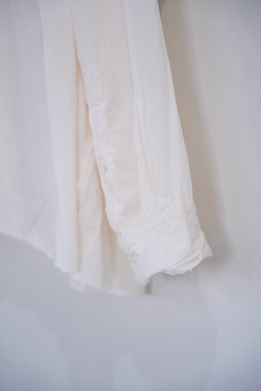 着用を繰り返すことで風合いが増し、体にも馴染み、ひっつく感じも無くなりますので、ご安心下さい。着丈も少し短くすることでドレスシャツの延長ではなく単体として着用しやすいように設計されてます。