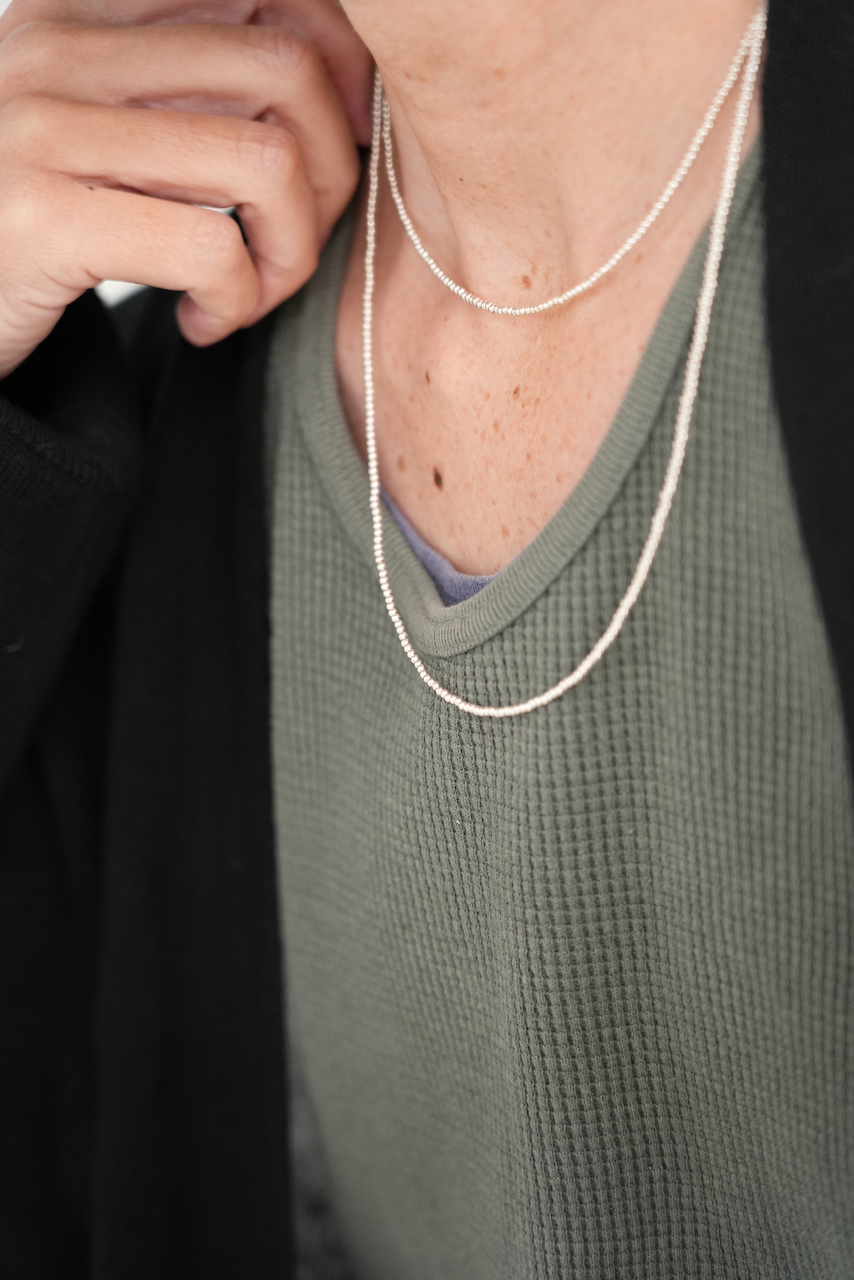 メキシコ・タスコで、華奢で軽さのあるペアネックレスを製作しました。小さな粒状のシルバービーズをつなぎ合わせたデザインで、長さの異なる2本がセットになります。 留め具部分はスムーズに着脱できるTバーのタイプを採用。2本を重ねて着用する だけでなく、2本の留め具部分をつなぎ合わせてロングネックレスとして使用する ことも可能です。