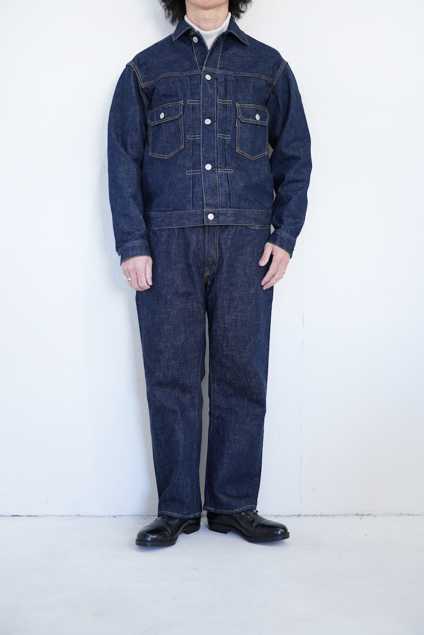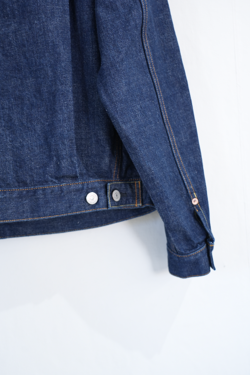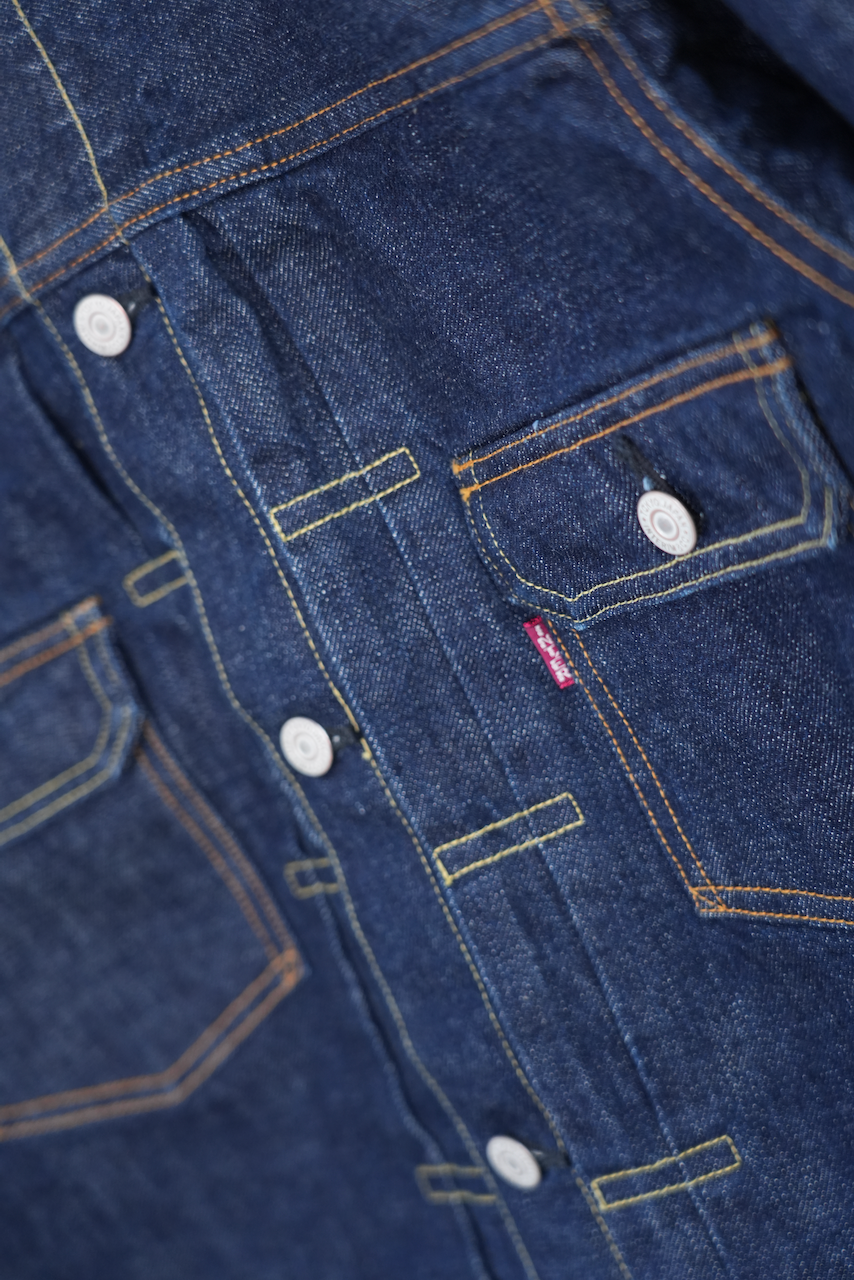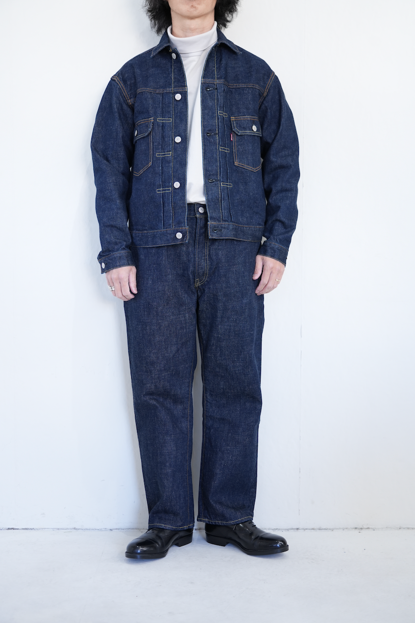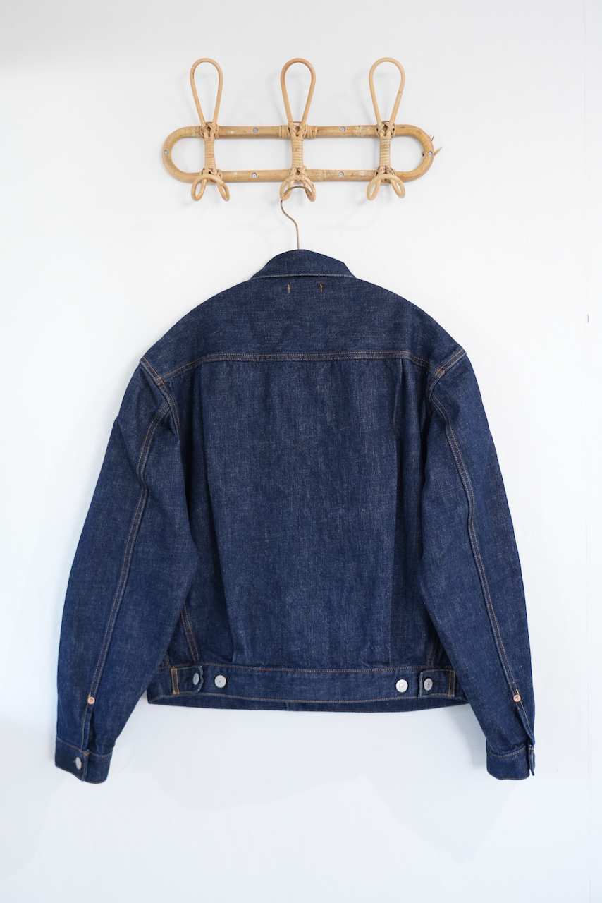 1950年代、"1st"モデルをマイナーチェンジして作られた"2nd"モデルをモチーフにしたデニムジャケット。当時供給された⽣地⼱の都合から⼤きなサイズにのみ採⽤された、バックの両サイドにハギをとった仕様で製作しました。両胸のフラップ付きポケットや裾のアジャスターなど、"2nd"らしいディテールを踏襲した他、前⽴てとカフスにはオリジナルで製作した鉄製のオリジナルロゴ⼊りボタンに特殊メッキ加⼯を施したものを採⽤。⽇本での作り⼿がほぼいないレーヨン100%、初期型仕様の⽚⾯の平織ピスネームを付けています。