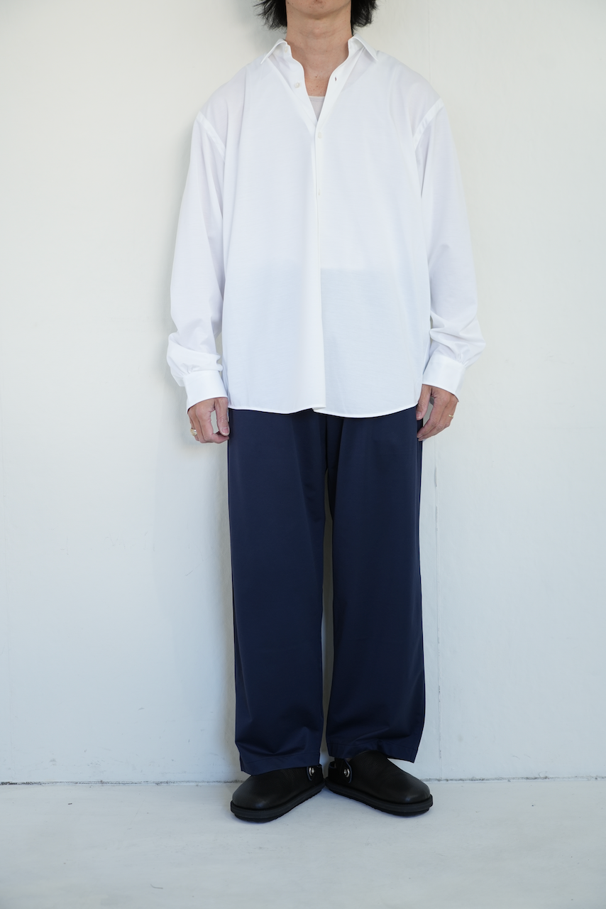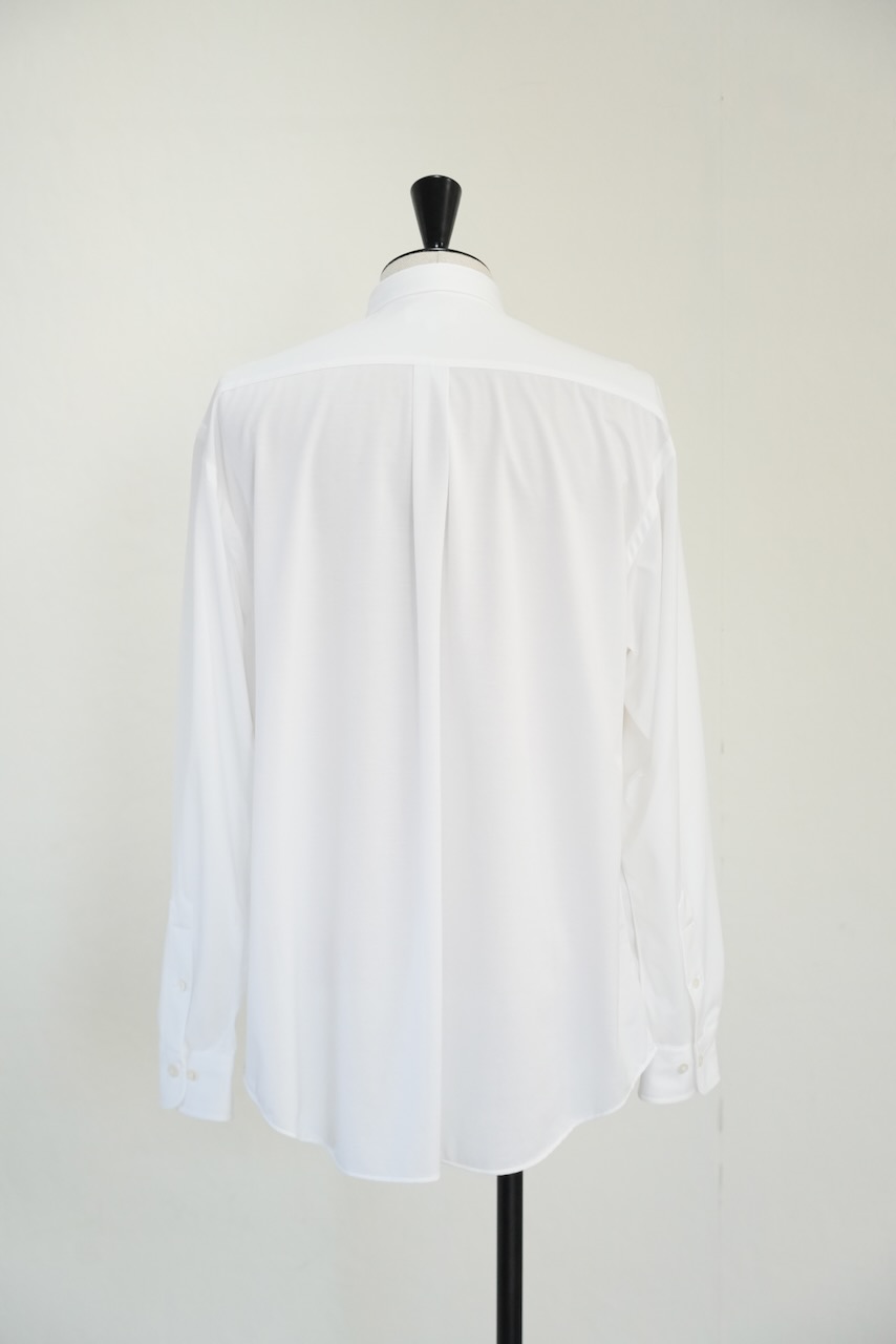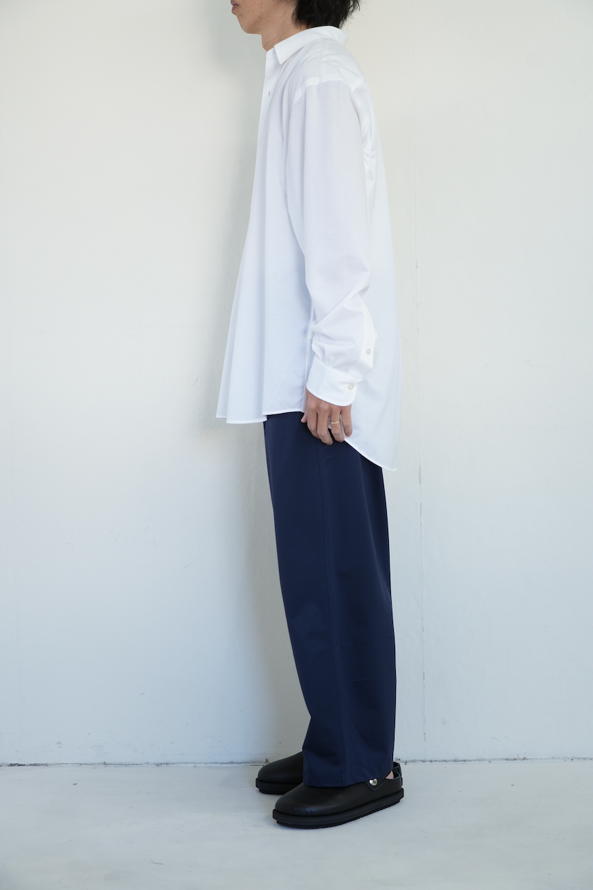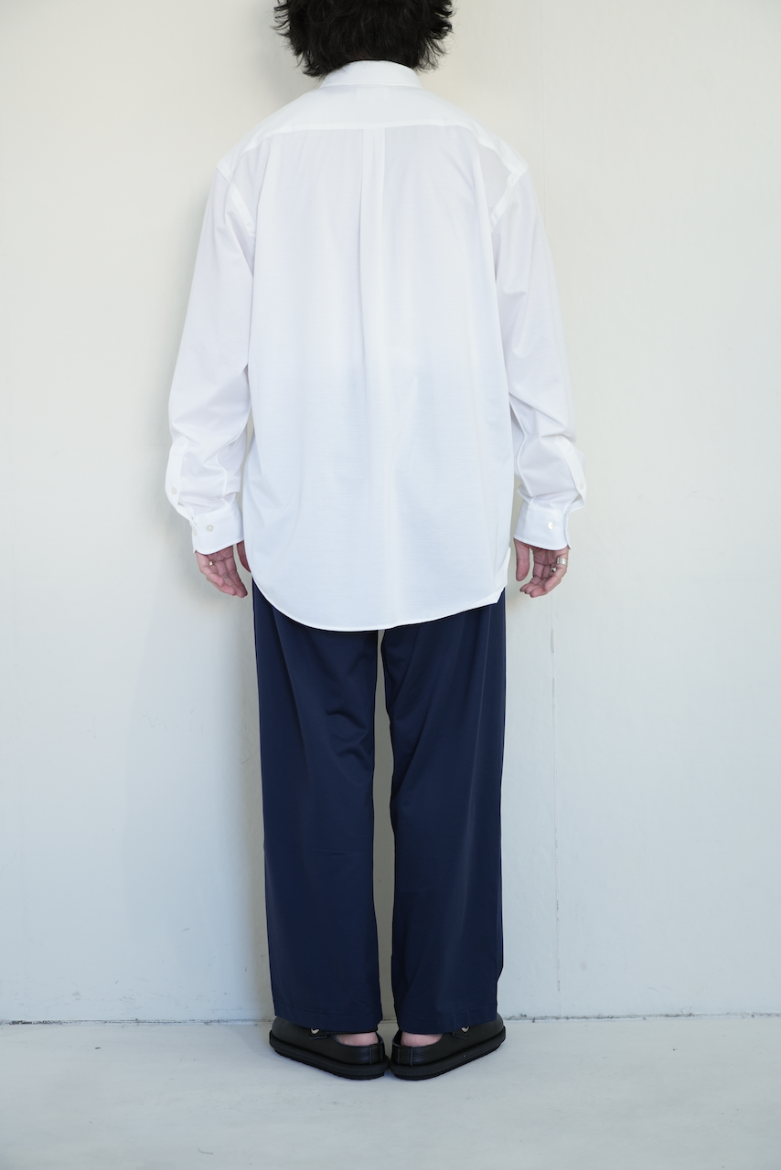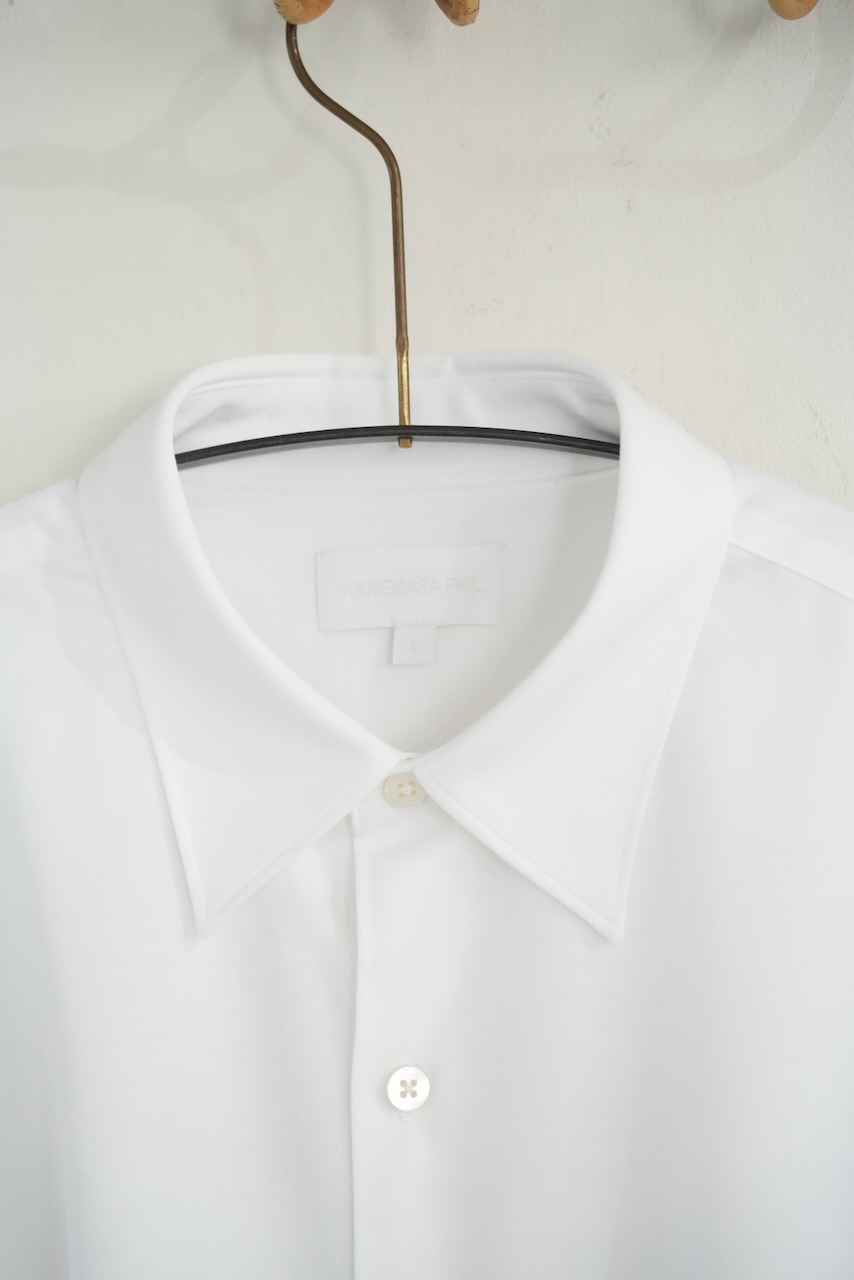綿糸の原料は、120/1 という細番手リサイクルスビンコットンを双糸使い。糸もガス焼きしたものを使うことで、より光沢感と洗濯後の毛羽を抑えております。50D 高捲縮リサイクルナイロンを使用し、ストレッチ性を出しております。今シーズンから釦裏側にブランドロゴを入れております。KANEMASA PHIL.のスタンダードシャツ。