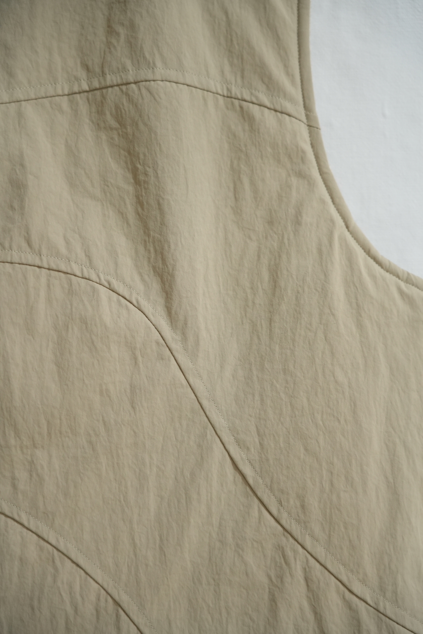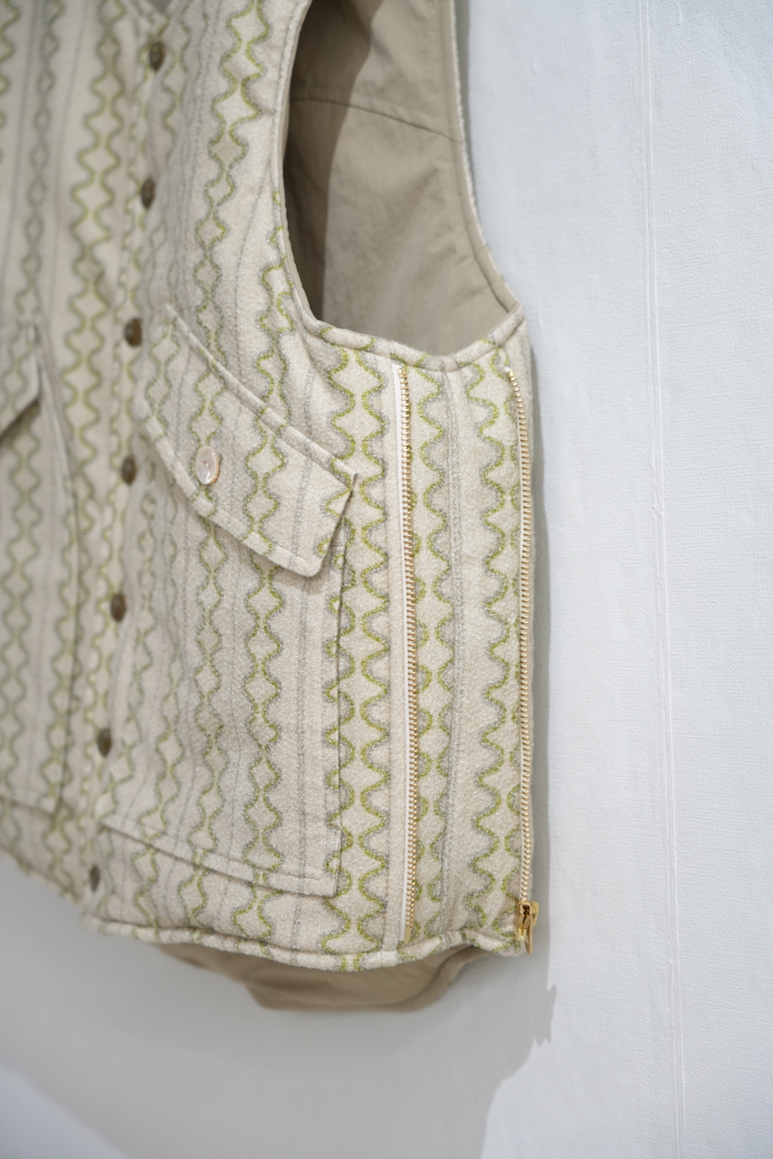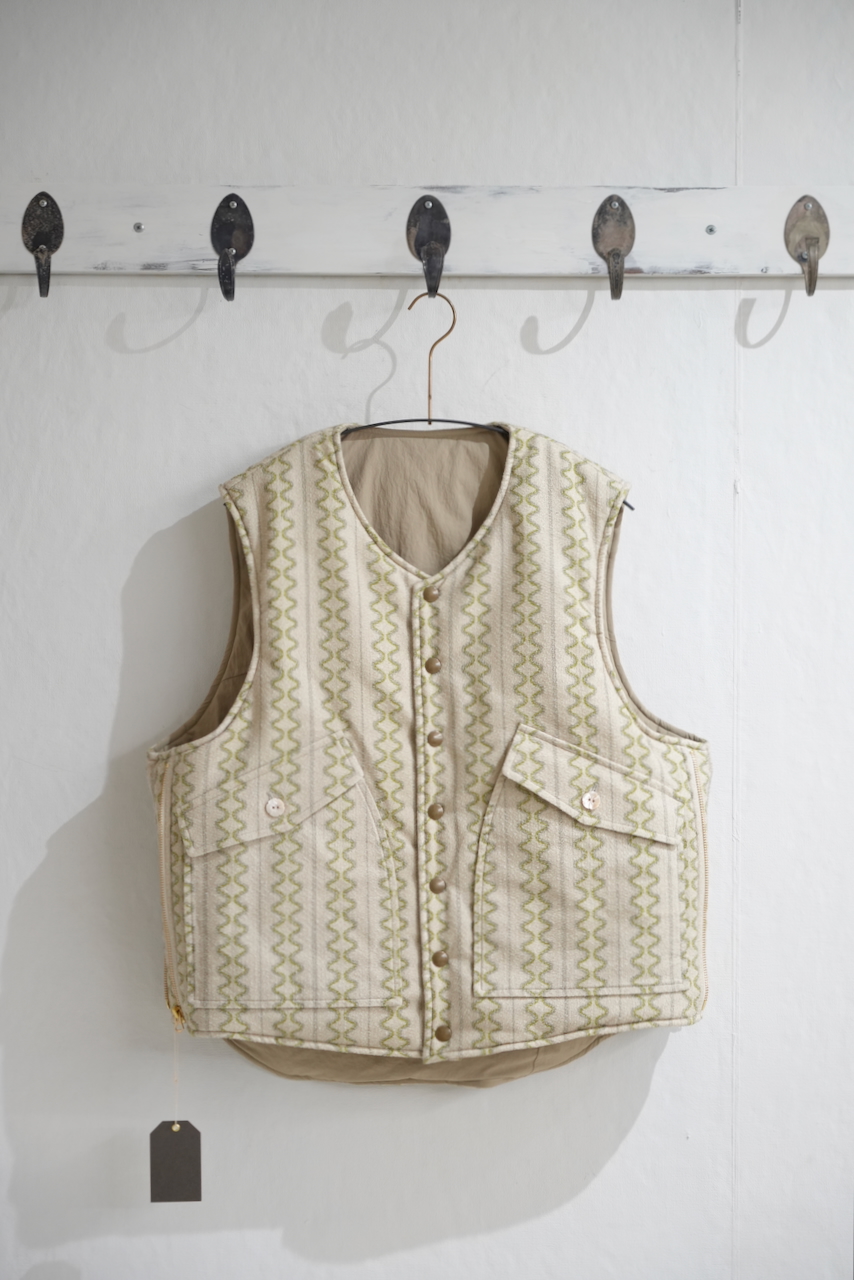 タスラン糸(無撚糸)を単一で使用し、軽さをもたらした撥水のナイロンとテーマにリンクしたペルーのナスカ文化の組紐技法の柄をインクジェットでネル生地にプリント。それをニードルパンチで空打ちして糸にひっかて生地に表情を出したオリジナルの生地を使い仕立てた中綿入りリバーシブルベスト。
