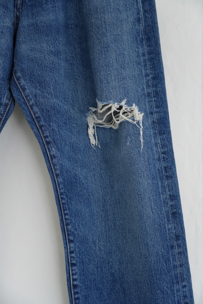 世界的にも加工、仕上げに定評のある工場で最後まで見ることで風合いの良いデニムに仕上がっています。こちらのモデルは職人の手仕事によってダメージ加工を施しており、デニム自体の経年と合わせてお楽しみ下さい。
