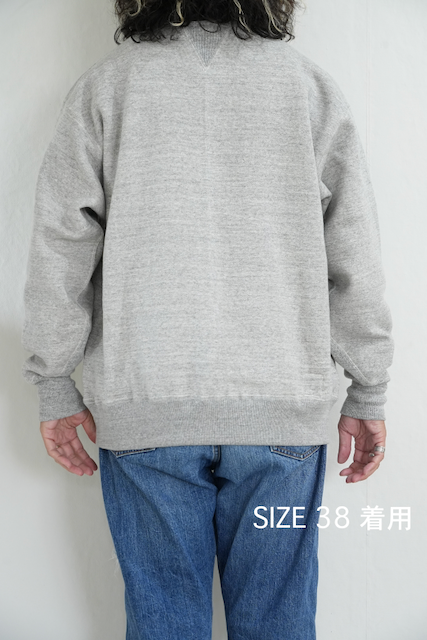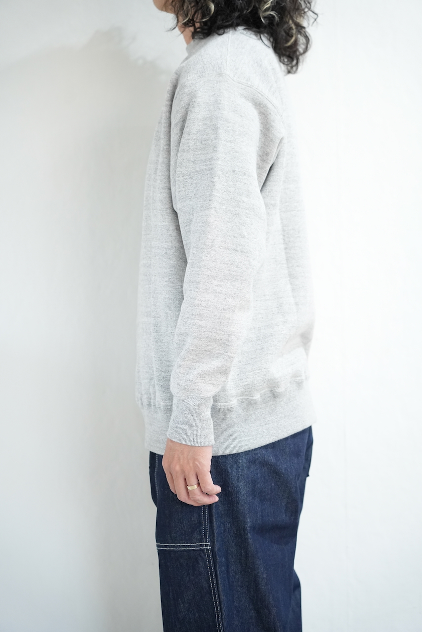 ・ボディーには和歌山県内のみでしか存在しない希少な吊り編み機によって編み立てられた裏毛生地を使用。丸胴ボディ・裾や袖口は無縫製の筒リブを採用。特に袖口のリブはV字にカッティング。