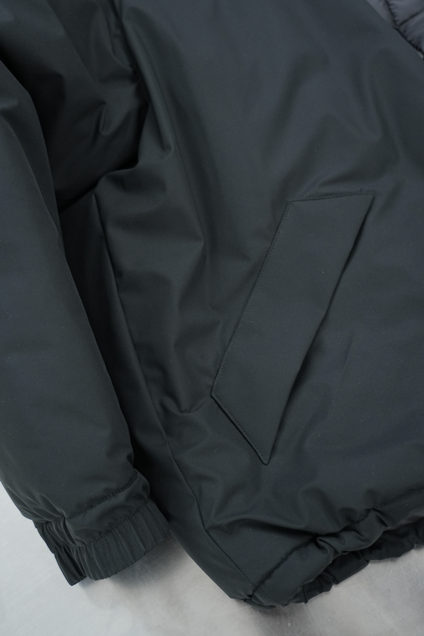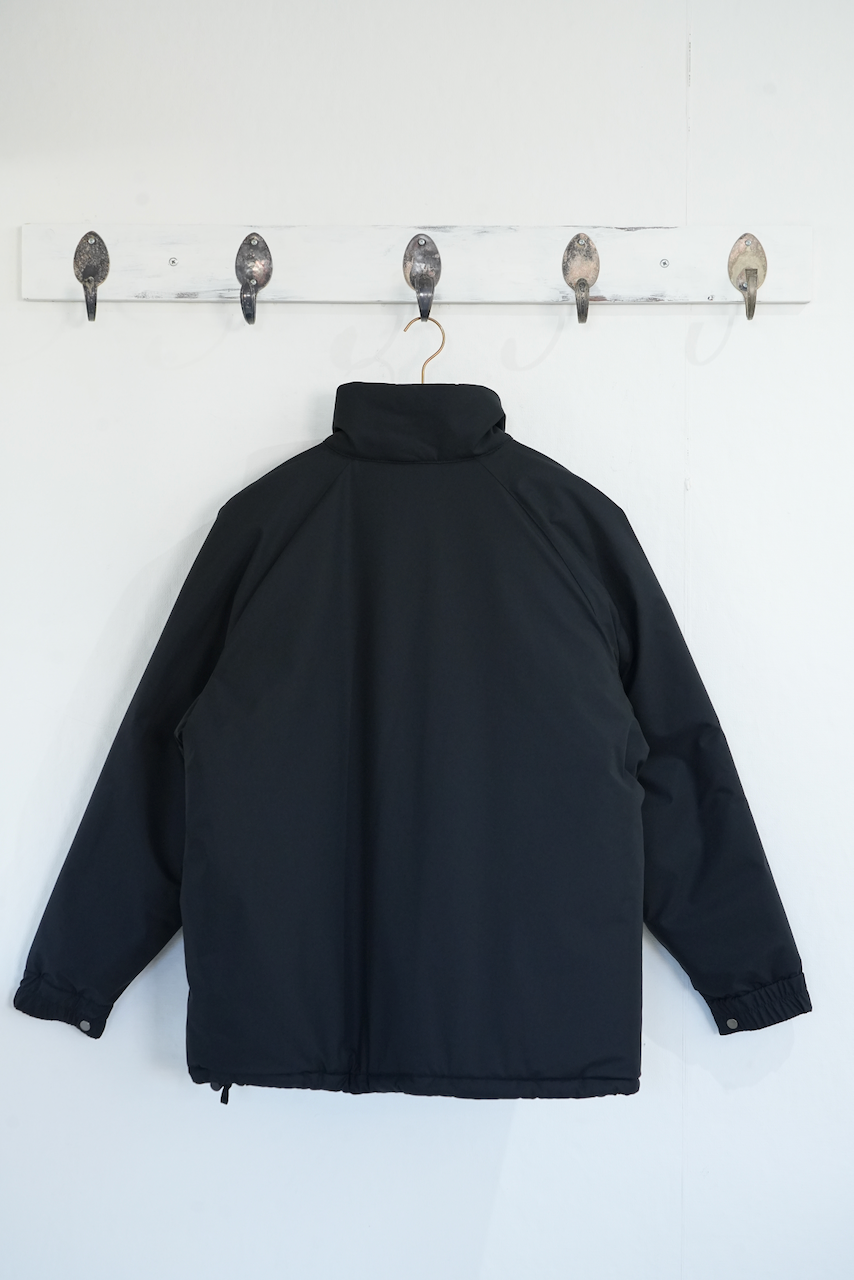 表地に⽇本発の機能素材「ダーミザクス」、中綿に⽶スリーエム社の「シンサレート」を使⽤した中綿ジャケット。1980年代のアメリカでスポーツ観戦時等に着⽤されていたナイロンブルゾンからインスピレーションを得つつ、装飾を省いたミニマルな表情に仕上げました。