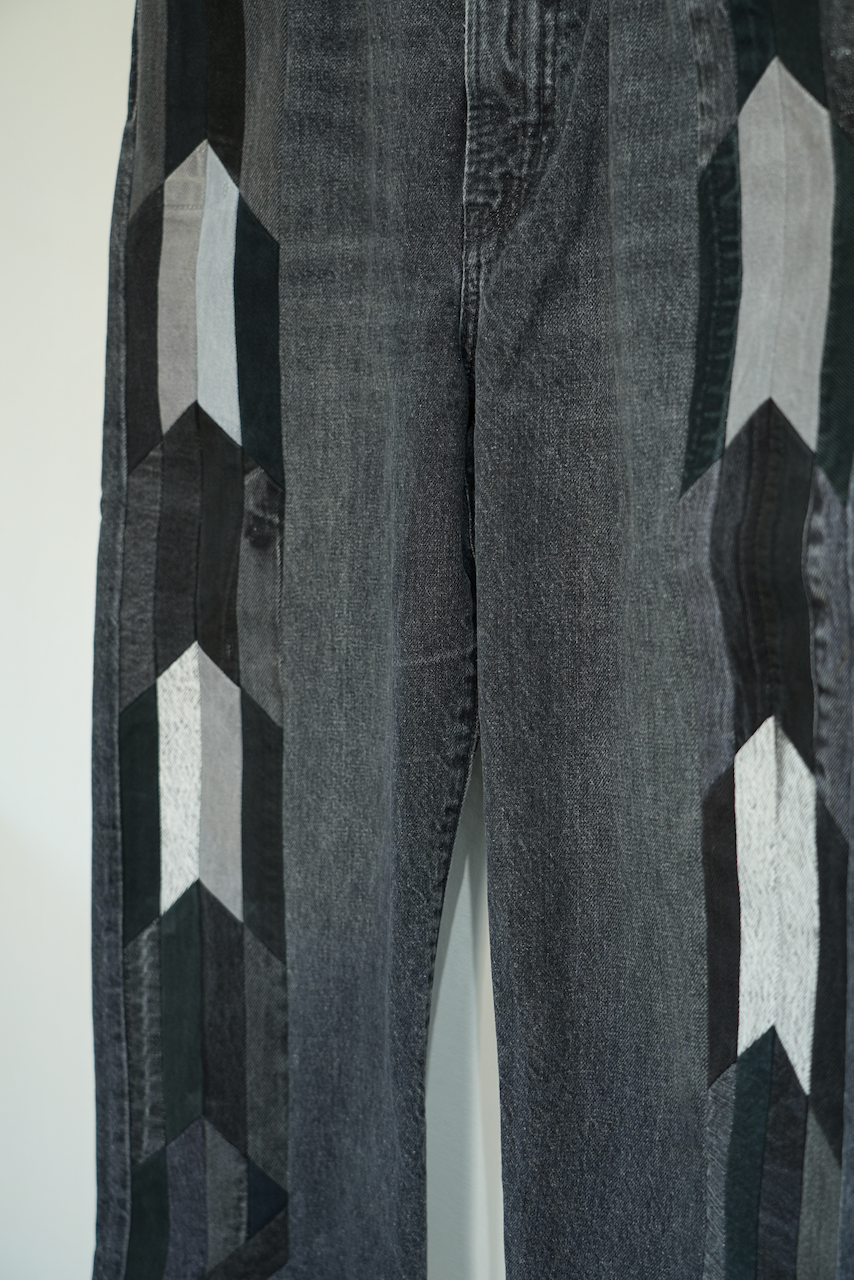 過度な装飾や加工に頼らず、古着の表情をそのまま活かしつつ矢絣をイメージしたフロント部分のパッチワークがアクセントに効いたCOTDらしい1本です。