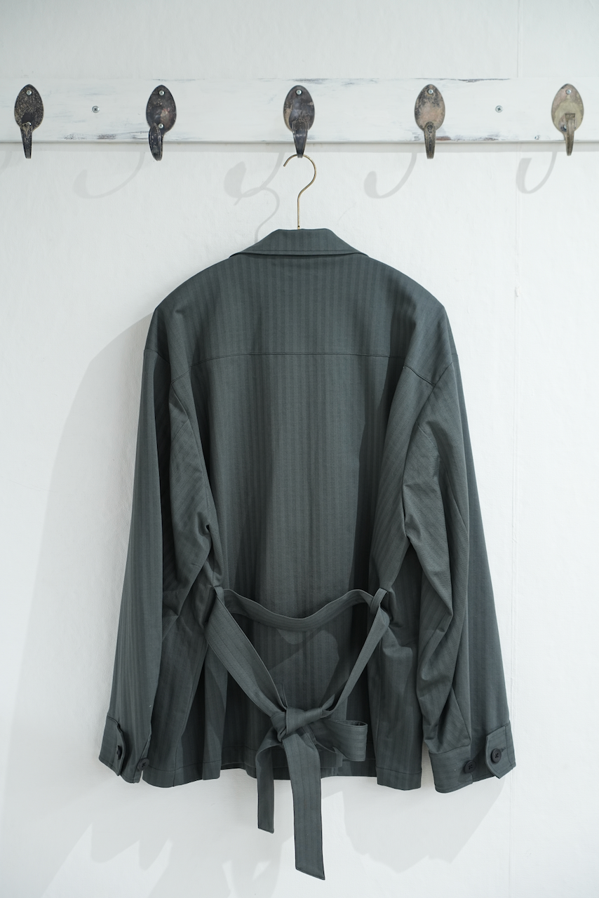 共地で作成したセンターベルトが特徴できなミリタリージャケット。しっかり巾をとったパターンで素材の見え方とは逆に、落ち感とハリ感のある丸みのシルエットが特徴。もちろん家庭洗濯可能です。