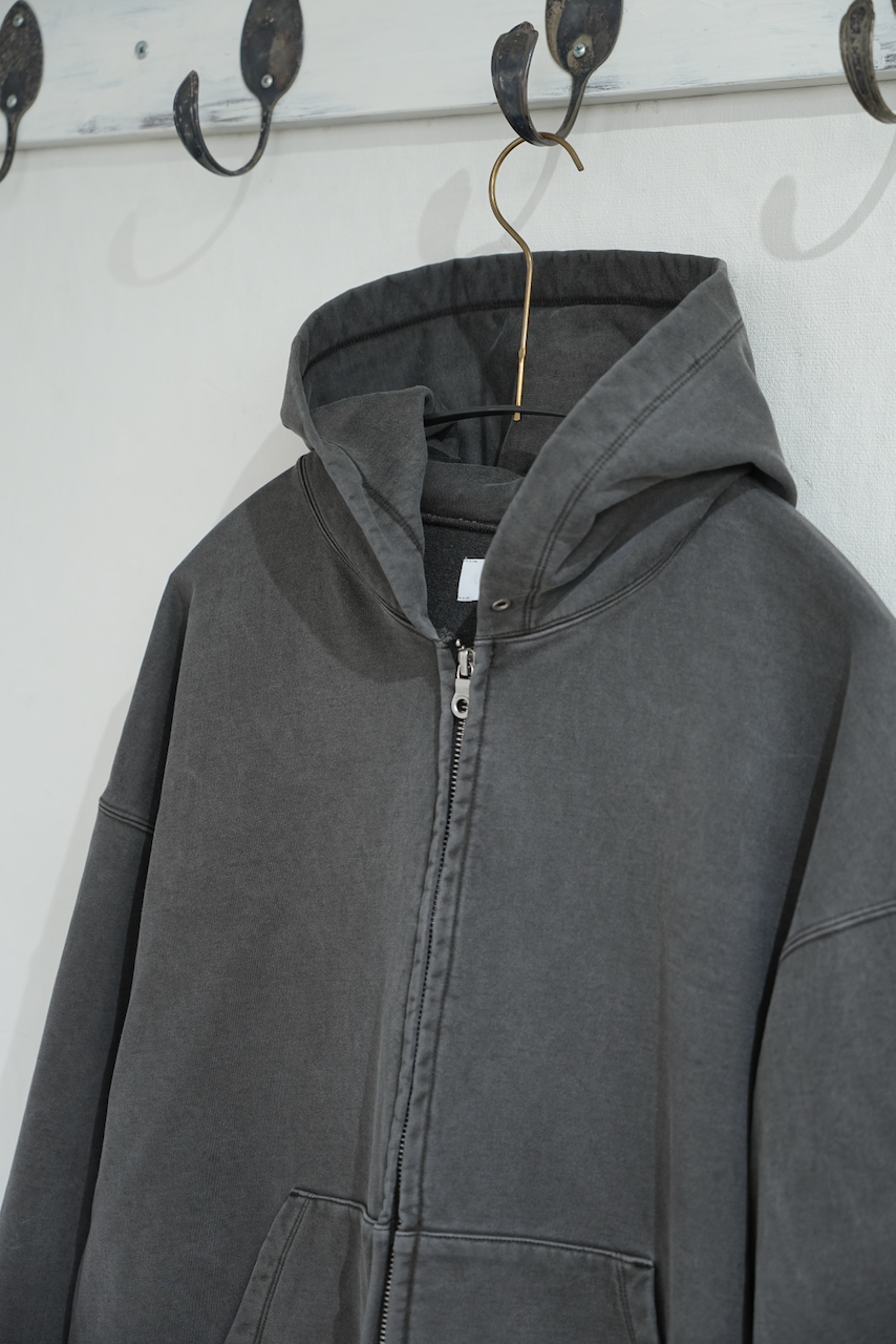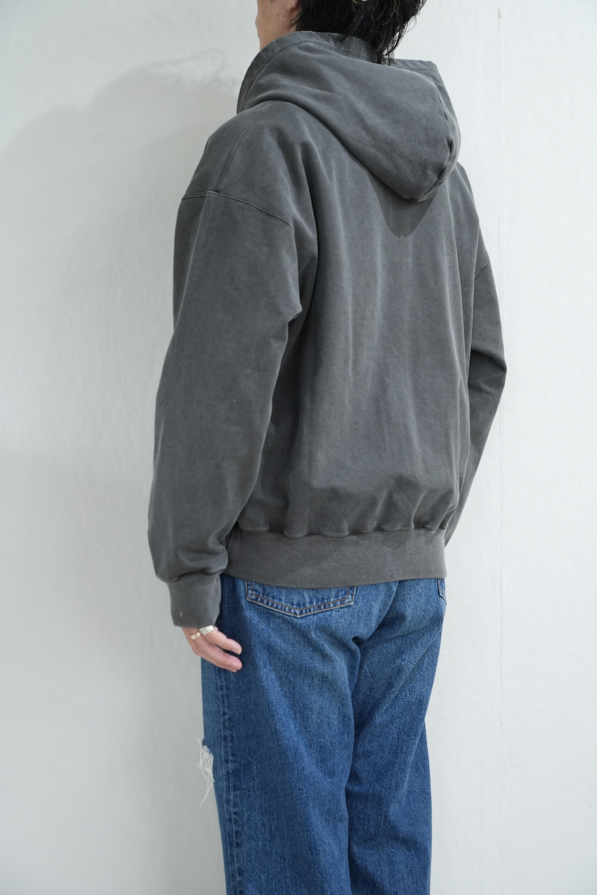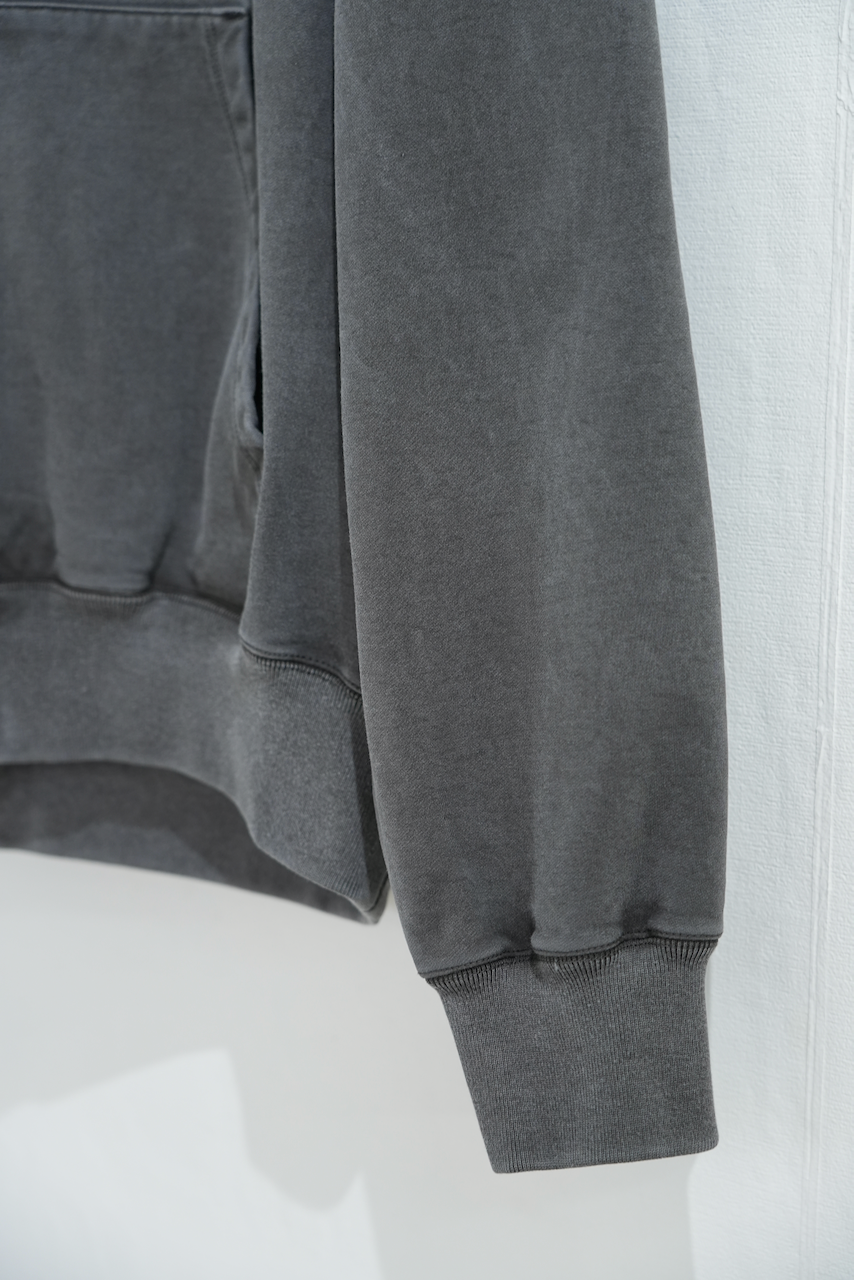 製品工程でタンブラー乾燥をすることで洗濯後の縮みなどがより無いように仕上げております。ピメントダイという特殊技法で染めており、色ムラが出やすく奥行きのある色目で仕上がります。着込むことで経年変化が起こり、高級素材と相反したヴィンテージ加工となります。アームホール、身幅から、フードまで全てのパーツを計算し、パターンを引くことで、生地のポテンシャルを最大限に生かしております。丸みのあるボックスシルエットを採用しているので、レイヤードにも向いております。天巾を調整しフードがより立つように設計しております。