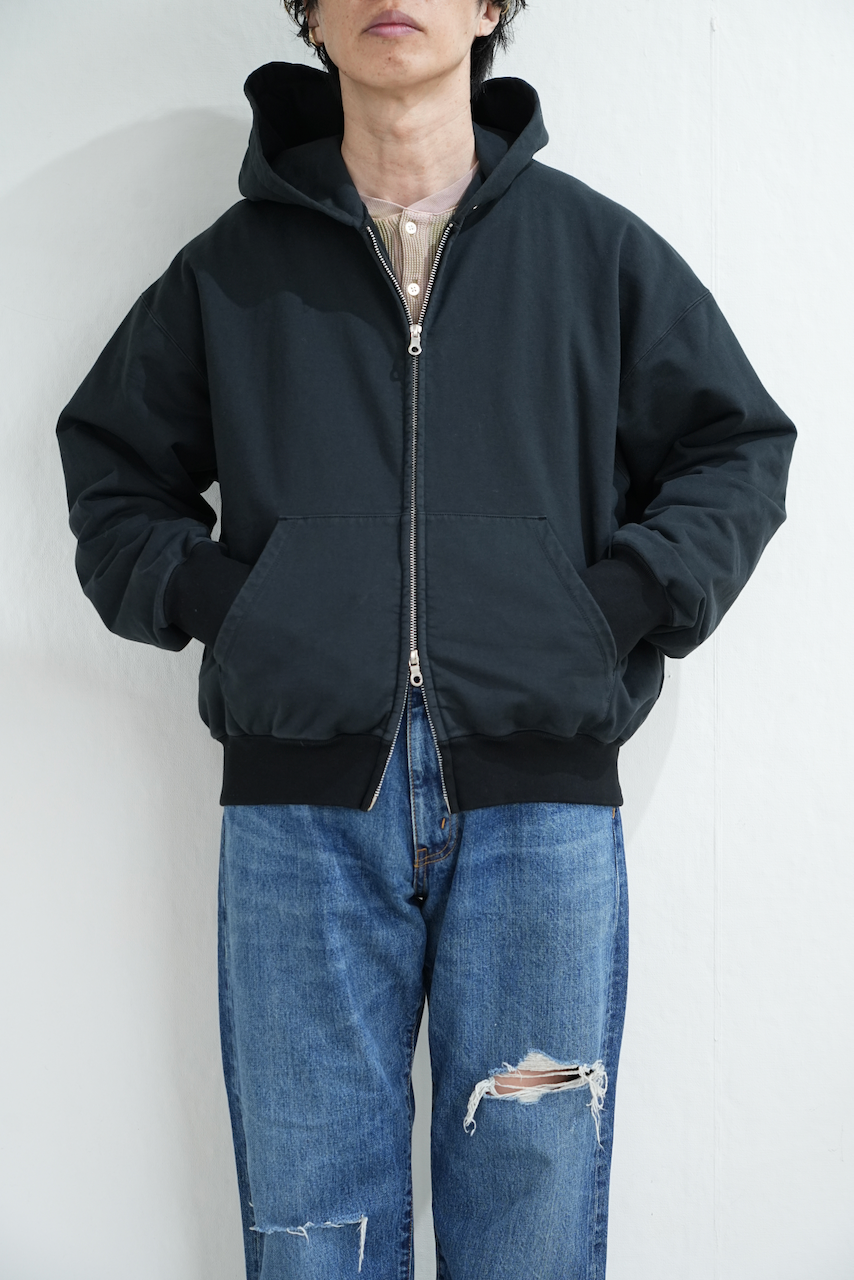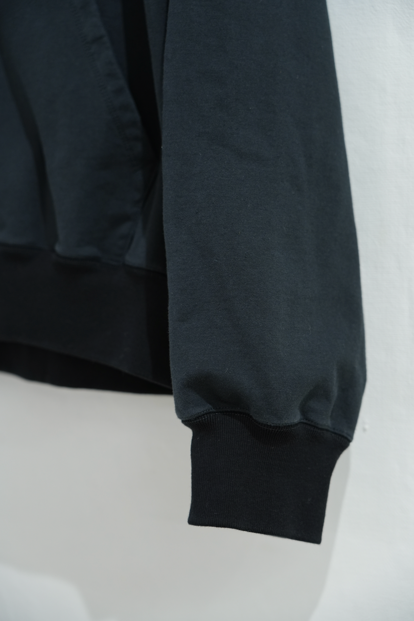 製品工程でタンブラー乾燥をすることで洗濯後の縮みなどがより無いように仕上げております。ピグメントダイという特殊技法で染めており、色ムラが出やすく奥行きのある色目で仕上がります。着込むことで経年変化が起こり、高級素材と相反したヴィンテージ加工となります。アームホール、身幅から、フードまで全てのパーツを計算し、パターンを引くことで、生地のポテンシャルを最大限に生かしております。丸みのあるボックスシルエットを採用しているので、レイヤードにも向いております。天巾を調整しフードがより立つように設計しております。
