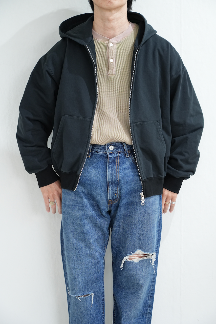 ジップパーカーの面構えも素晴らしく、洗いをかけたことによるファスナー脇のリアルなアタリ感。