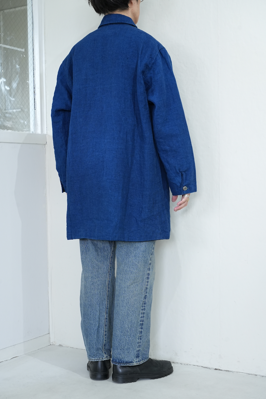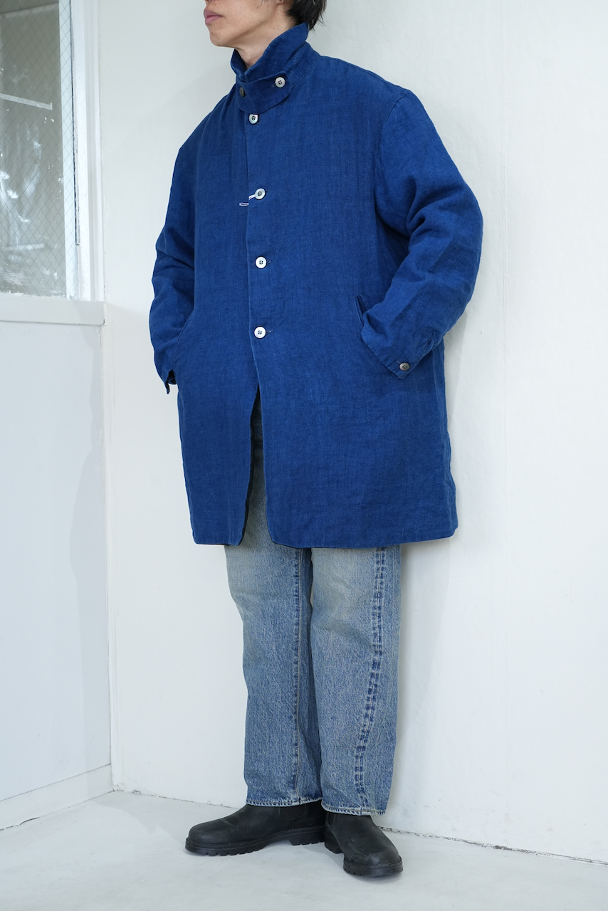 The previously released indigo-dyed "Sakura Coat with Indigo" has been brushed up and reproduced using 100% linen fabric dyed with genuine indigo.