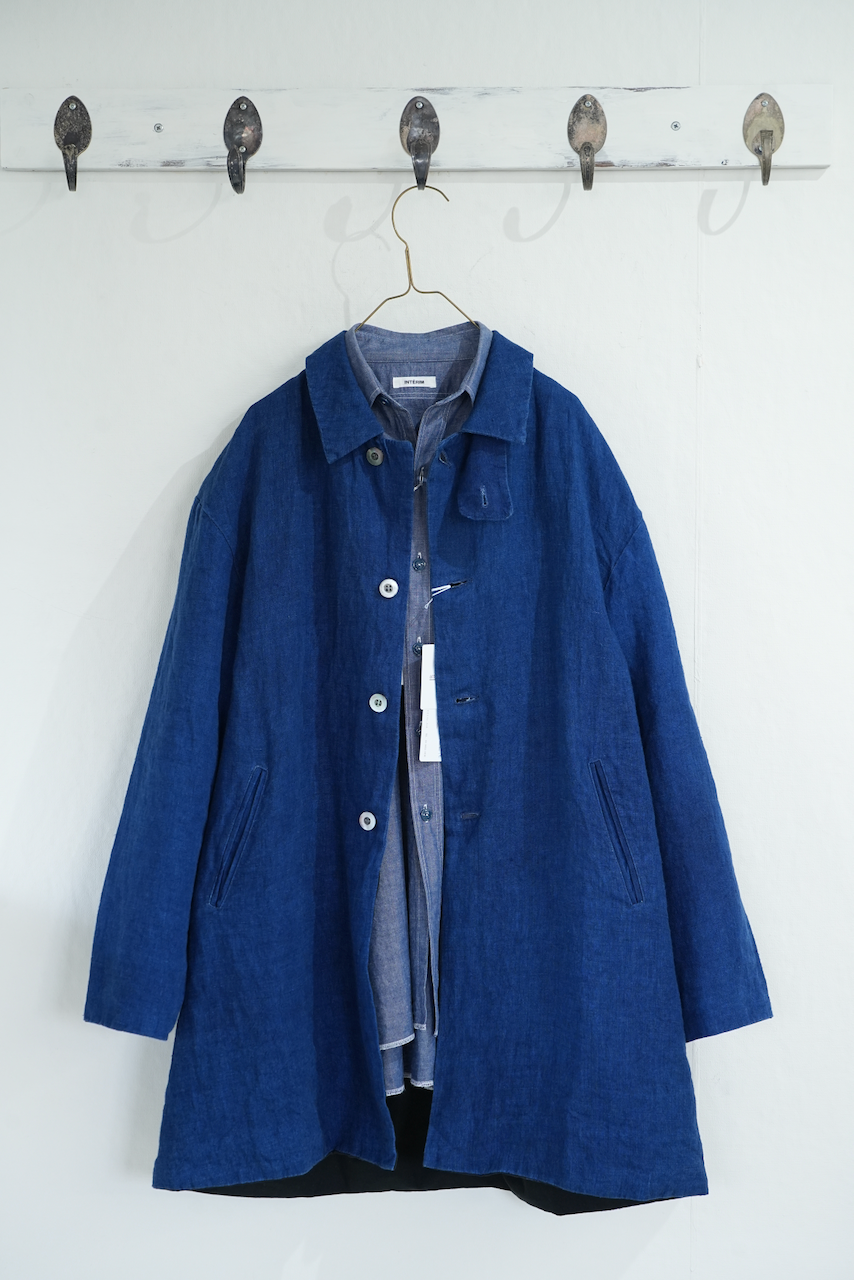 EEL Productsの風物詩「サクラコート」をリネン素材で藍染にした風合いの良い一着が入荷しました。通常の馬布を使用した表生地の張り感は柔らかい表情で肩周りからシルエットのオチ感がよいコートです。内側は黒色のコットン生地なので色移りの心配もなく、お手入れなど神経質になる心配も少ないかなと思います。春を想像した時、個人的にもひさしぶりにグッとくるコートでしたので気に入って頂けたら嬉しいです。