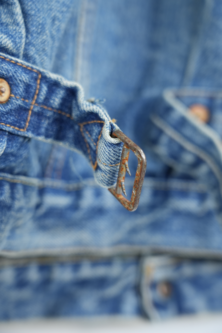 SHABBY VINTAGEは40年代〜50年代のXXの個体で極限まで⾊が落ちたヴィンテージの「ボロボロ感」を再現するために削りやブリーチ、オーバーダイを含む各種ウォッシュを施しました。⻑年にわたって着込み、⼗分に経年変化した質感を表現するため、あえてボタンにも加⼯を施しています。