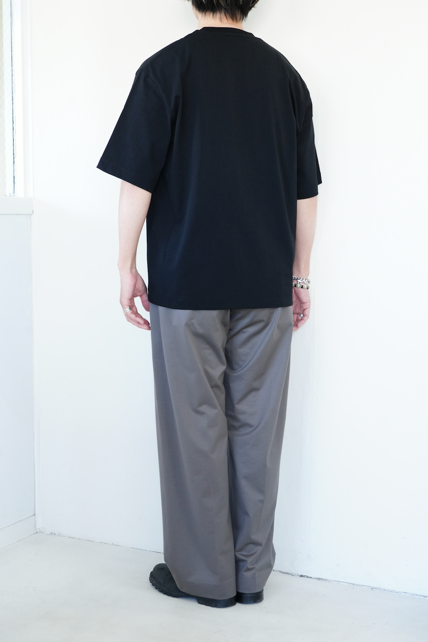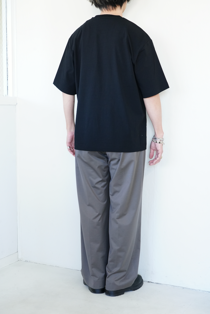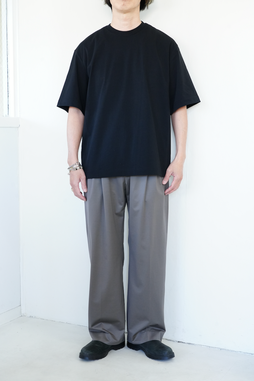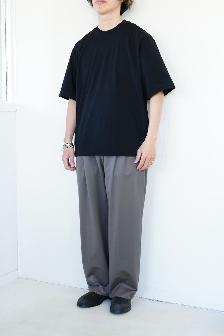 こちらの同生地パンツになります。今回は1から見直してツータックで作りました。ハリ感と落ち感が適度にあり「ザ・イージーパンツ」というカジュアルな雰囲気から、皆様が求める「綺麗さ」を意識して穿けるようにしました。