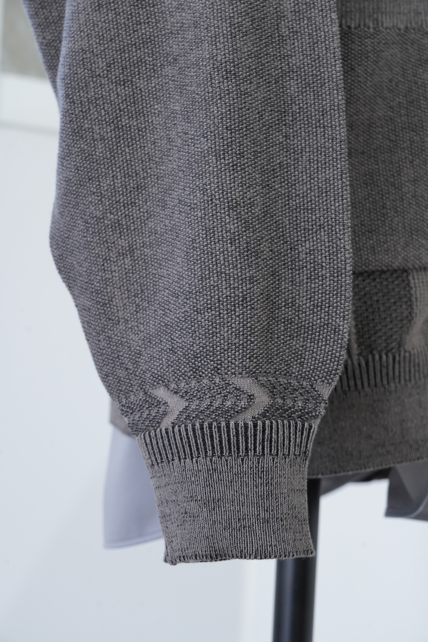 プレーティング編みと言われる表目側と裏目側で異なる糸を編む技法を使用し、表と裏で糸の色を変えて、2色で編むことで奥行きのある表情に仕上げました。