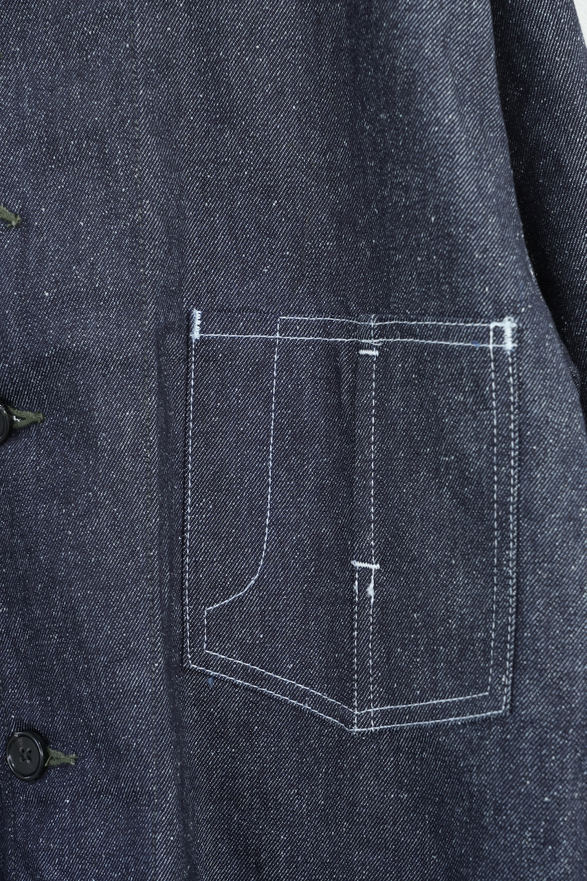 チンストは当時特有のクラシックな形状を踏襲し、左胸には特徴的な変形ポケットを配置。裾はわずかにラウンドし、ポケット内側には補強布を当てるなど細部までヴィンテージ仕様を再現。ステッチはホワイトとグリーンを使い分け、配⾊や運針に変化を持たせました。⼤ぶりの本⽔⽜ボタンとゴートレザー襟を⿊に統⼀し、素材使いにもこだわった特別な⼀着です。