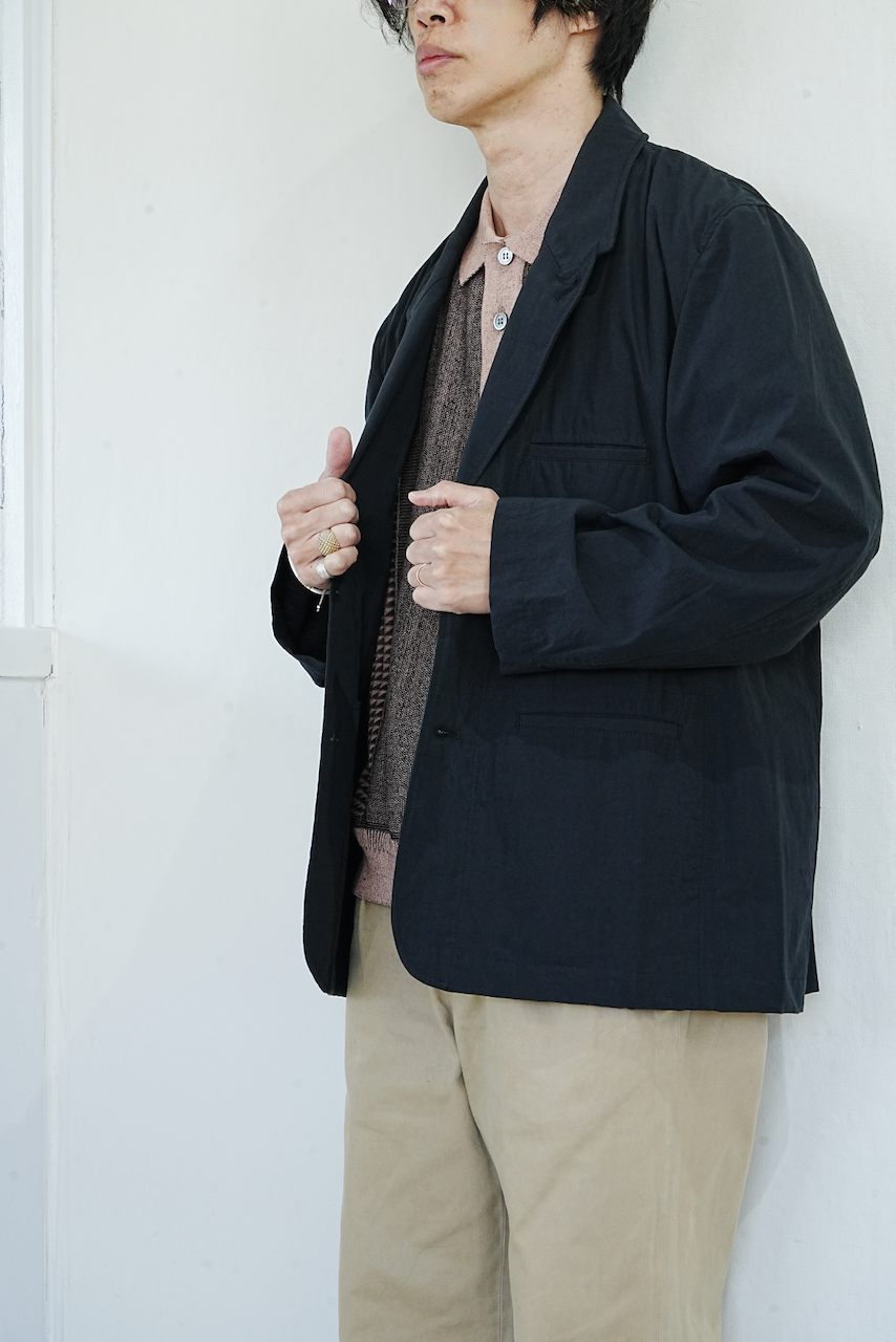 出ました!!地元・遠州の綿シャツ生地、高密度で肌あたりが軽く、ザラっとした清涼感のあるあの生地(平織りかと思われます)...それをラペルのやや大ぶりなジャケットに仕上げております。
