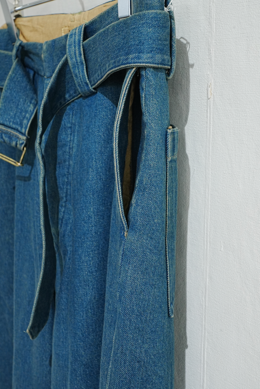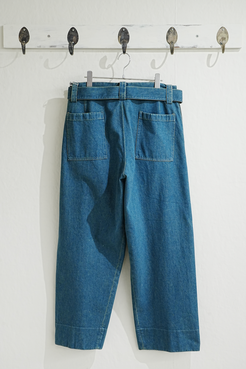フレンチモーターサイクルパンツからインスピレーションを得た、共地ベルト付きのトラウザーズ。元々オーバーパンツとして開発されたという同型へのオマージュから、ベルトを絞って着⽤できるように他モデルよりやや⼤き⽬に仕⽴てています。