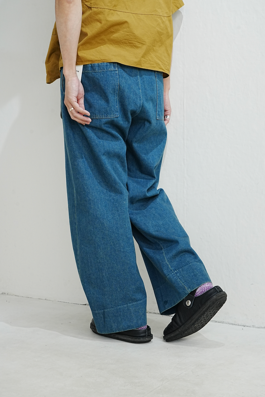 経⽷にやや細めの⽷を使⽤することで軽さを持たせた、約10ozのミドルウェイトセルビッジデニムを採⽤。ストーンを加えたバイオウォッシュで⾃然なアタリとパッカリングを引き出し、その上からオーバーダイを施すことで、リアルな経年変化を表現しました。着⽤による⾊落ちではなく、⻑年倉庫に眠り、湿度や埃によってゆっくりと変化したような、独特で深みのあるフェード感を再現した仕上がりです。