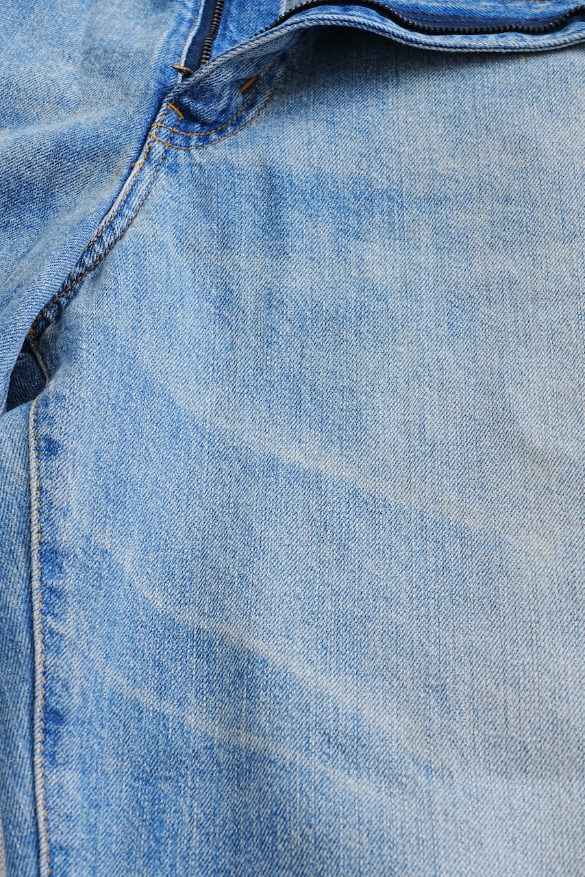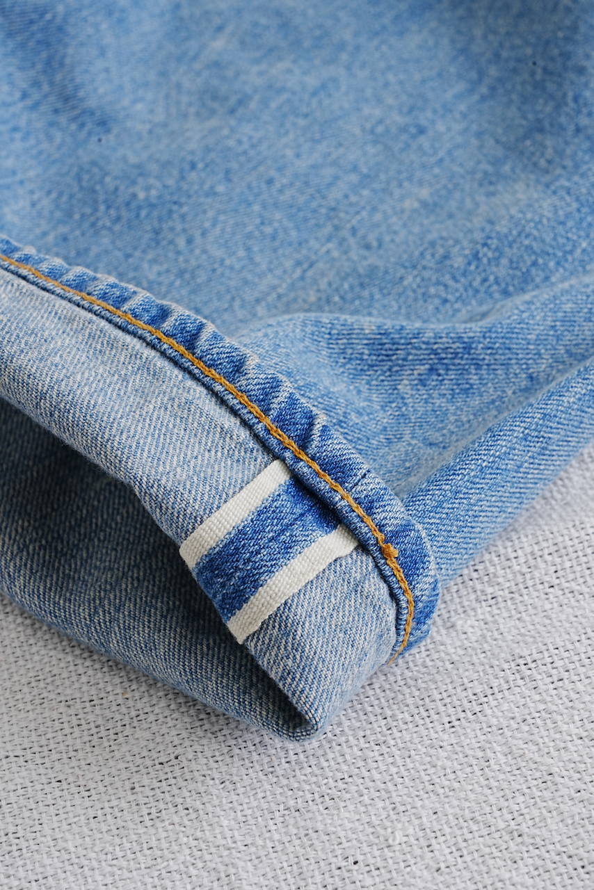 50年代後半にアメリカで製造されていたデニムの糸の太さや本数まで計測して解析し、米綿100%糸を使用して、岡山にて製織、縫製。日本の暑い夏でも穿けるように11ozにて。