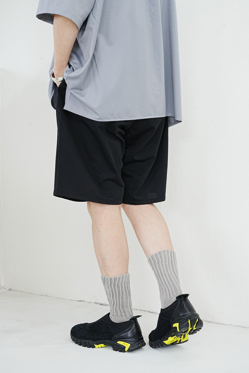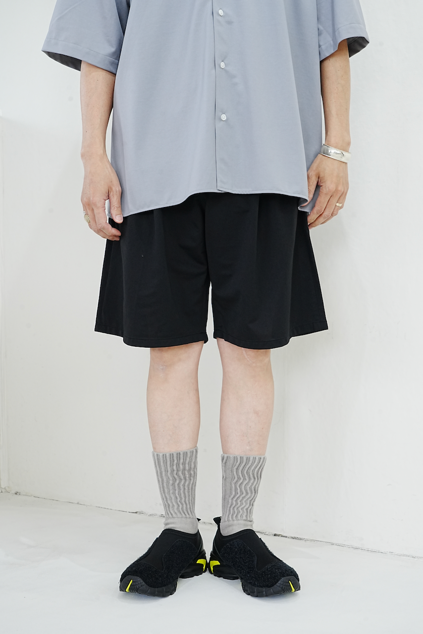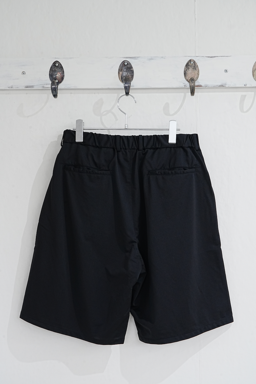 深くタックを入れたイージーショーツ。ベルトループもある為、様々な着用の仕方が可能です。ストンと落としたストレートシルエットです。