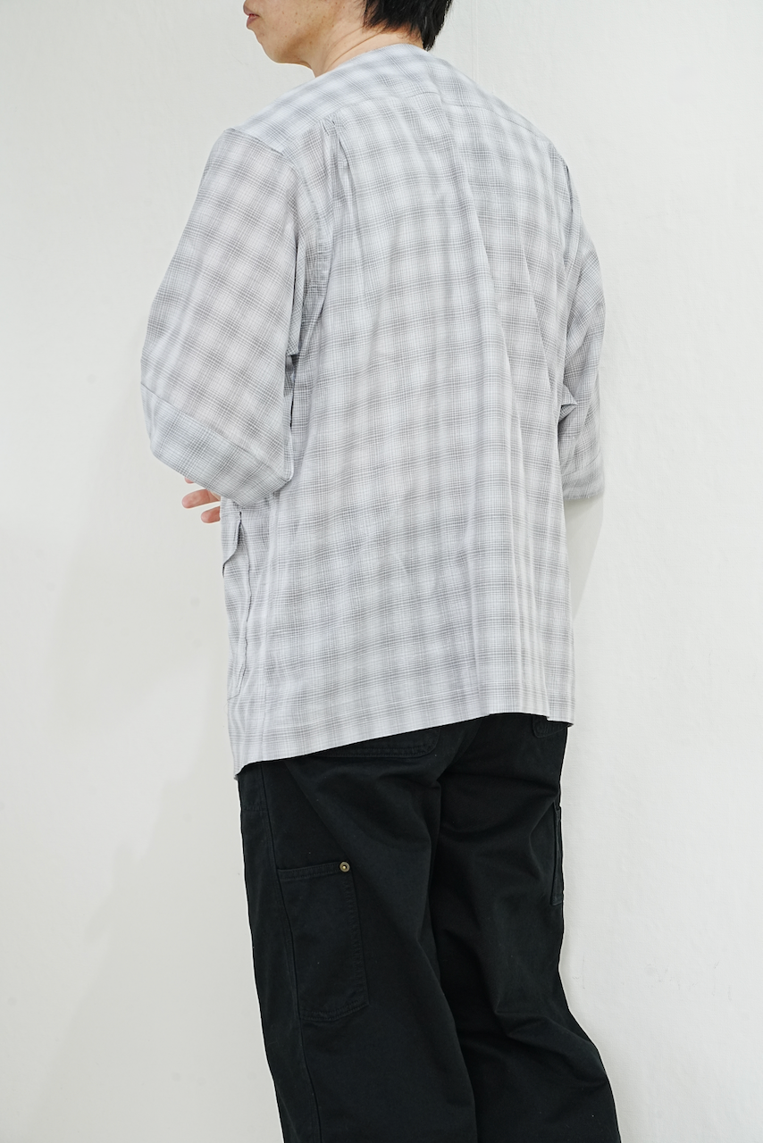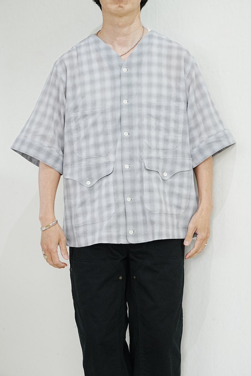 猟師という職業をイメージした某社のティンクロスのハンティングシャツをSTEAFらしくアレンジしたデザイン。生地のオンブレチェックはシルク糸を横糸に極限まで入れながら今では大変貴重な1970年代の織り機で繊細に織っています。一人の職人が全ての工程を一人で行う丸縫いで縫製し上品な着心地を演出しています。古着にはないサイズ感と立体パターンも特徴。